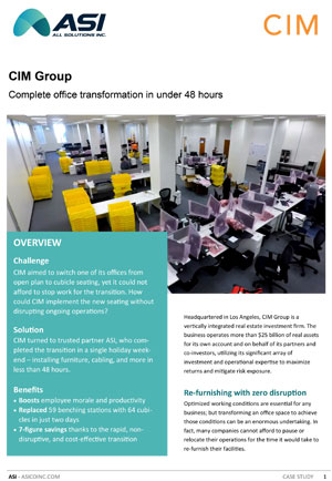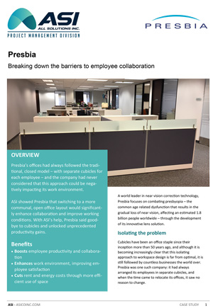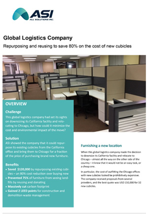 ASI - All Solutions, Inc. (asicoinc) delivers outstanding outcomes through project management solutions. Services include real estate negotiation, cost tracking, relocation and reconfiguration, commercial construction, installation management, timeline development/management, IT management, move management, disposition services, asset tracking, employee relocation, case studies and office furniture procurement solutions.